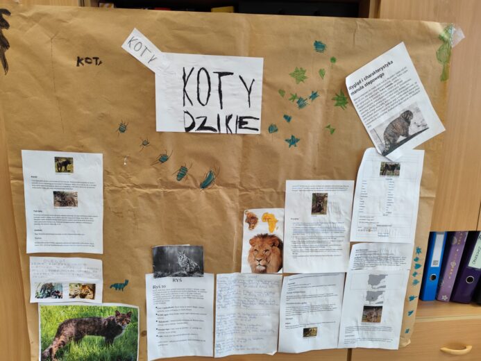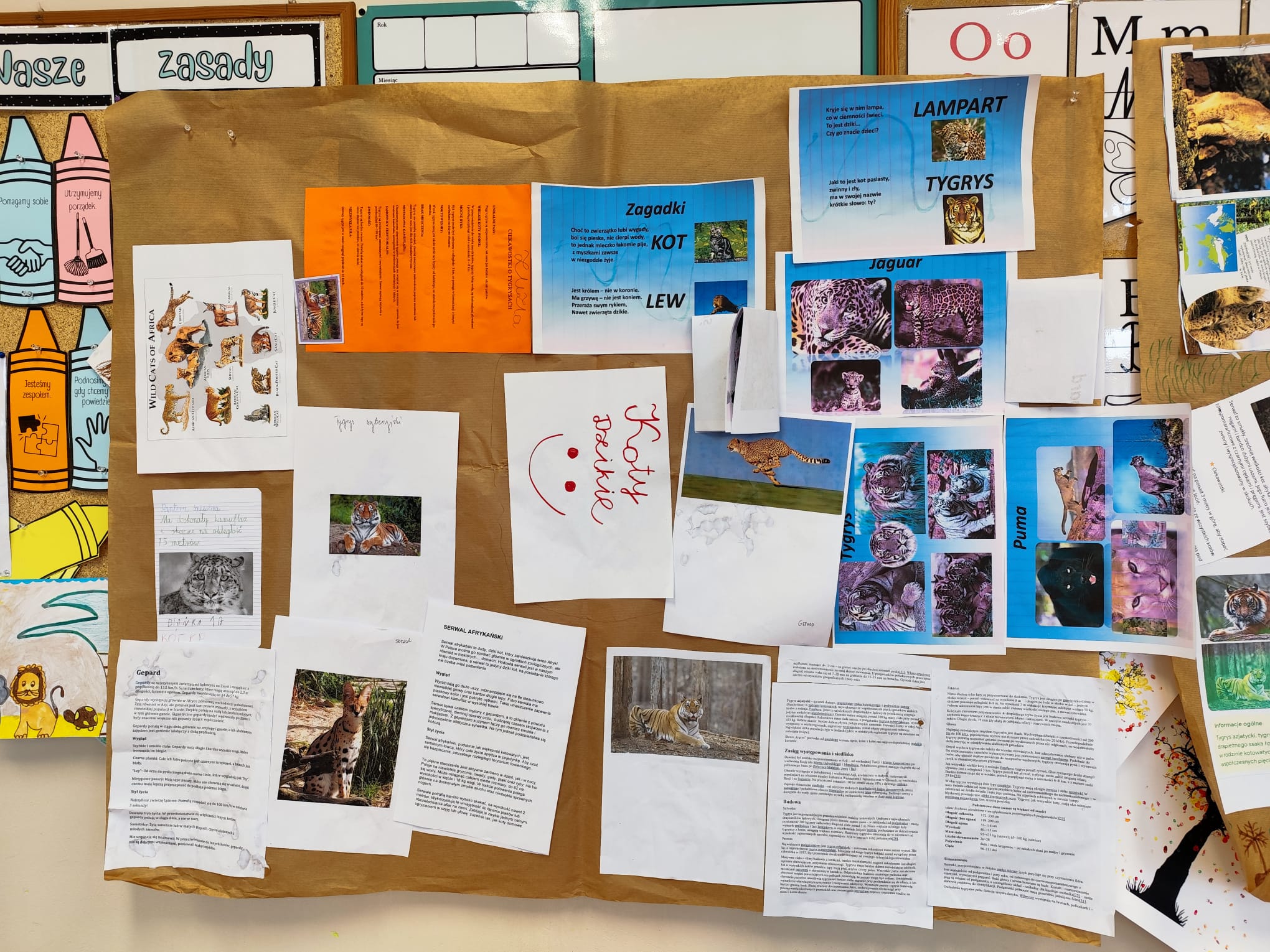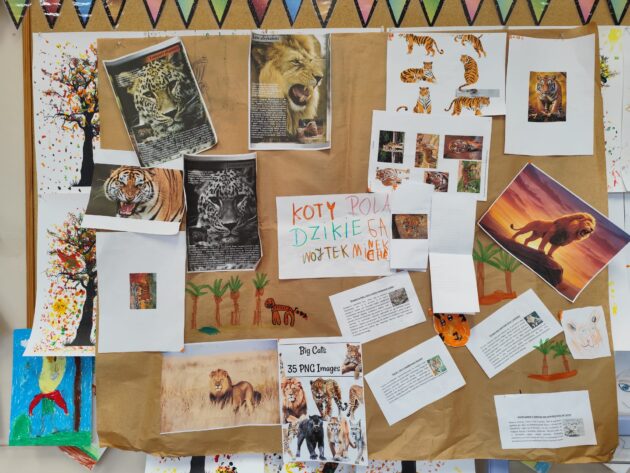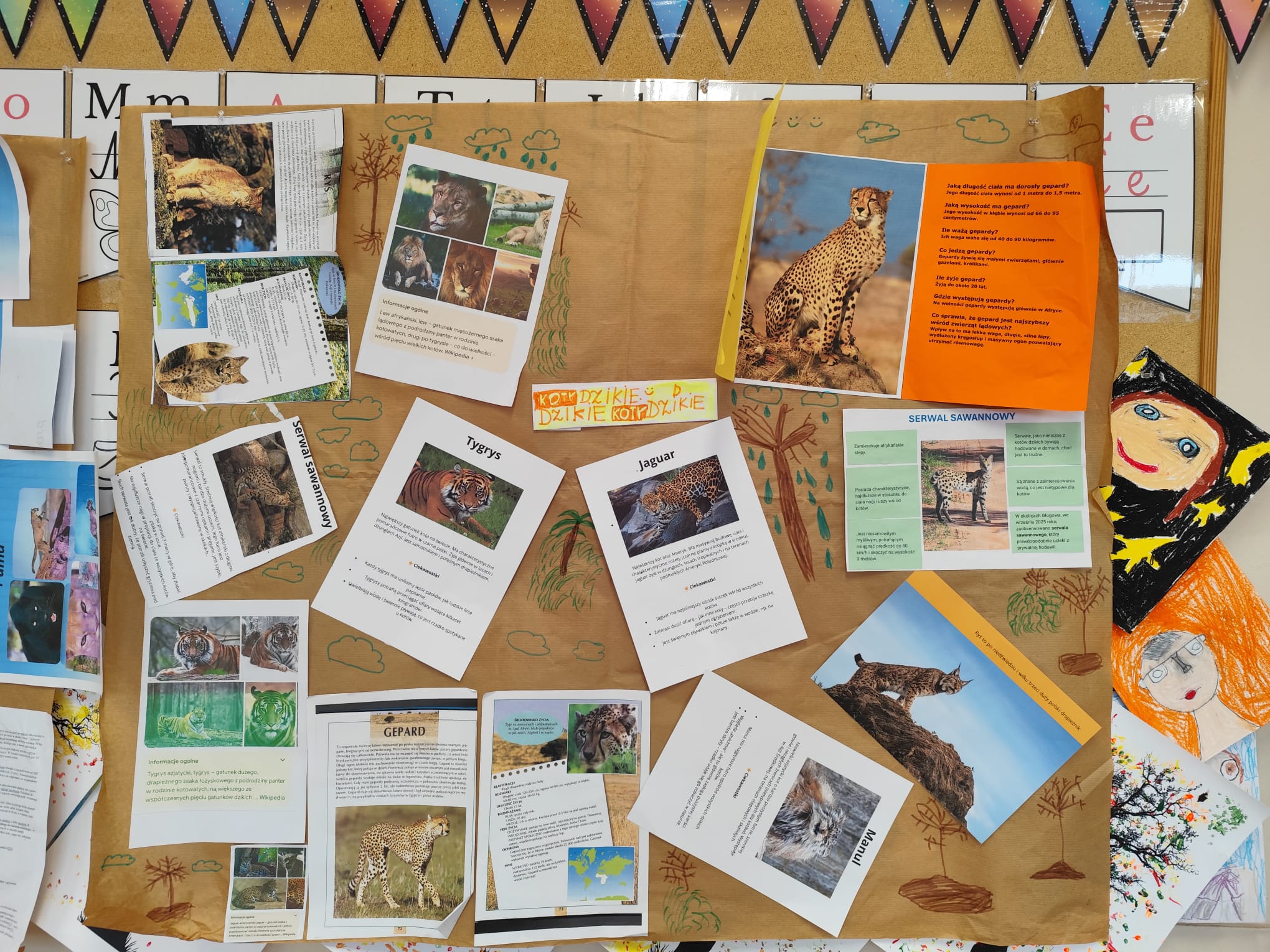 W dniu 25 listopada 2025 r. w czasie zajęć edukacji wczesnoszkolnej uczniowie klasy 1a pracowali metodą projektową nad tematem “Dzikie koty”. Zgromadzili mnóstwo interesujących informacji  z  książek oraz Internetu, które wykorzystały do wykonania zadania i przyklejania  na dużych arkuszach papieru. Najciekawsza była prezentacja każdego zespołu, która z każdym nowym zdaniem  zaskakiwała ciekawostkami.  Sami uczniowi zajęcia podsumowali słowami: “Było kreatywnie”, “Podobało mi się”, “Fajna zabawa”, “Pracowicie”. Efekty pracy na zdjęciach.