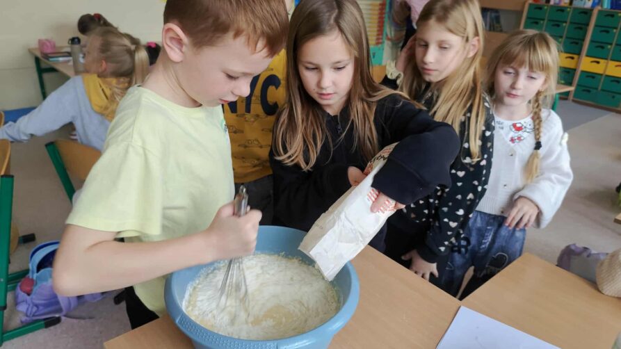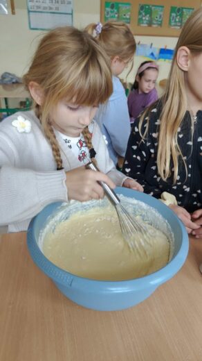 W II grupie świetlicowej odbyły się zajęcia kulinarne, podczas których dzieci piekły gofry. Uczniowie samodzielnie przygotowali ciasto na gofry, poznając przy tym przepis i kolejność jego wykonania. Po upieczeniu gofrów uczniowie z radością dekorowali je według własnych pomysłów, wybierając różne dodatki: dżem truskawkowy, bita śmietana, kolorowe posypki. Zajęcia sprawiły dzieciom wiele radości, a wspólne pieczenie było okazją do integracji grupy oraz przypomnienia zasad i higienicznej pracy.