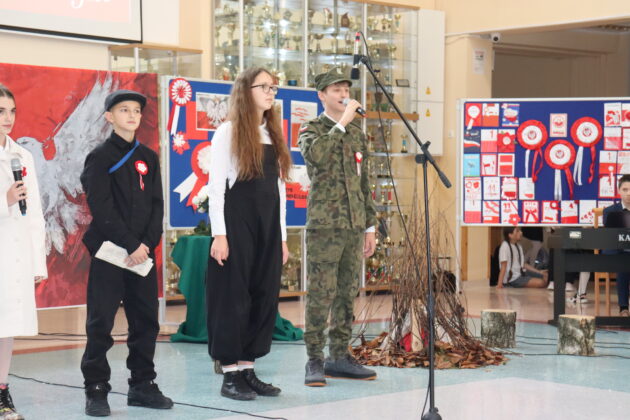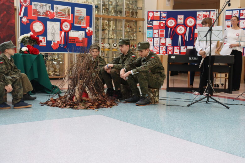 Na korytarzach pojawiły się biało-czerwone dekoracje i gazetki historyczne. Był to dzień pełen refleksji, patriotyzmu i dumy z naszej Ojczyzny. Dziękujemy wszystkim uczniom za piękne śpiewy i recytacje oraz nauczycielom, którzy przygotowali ich do tych występów, Paniom: M. Bartkowiak i A. Jaślar. O oprawę plastyczną zadbały Panie: J. Donaj, Ż. Ścisłowska, A. Czechowska i A. Urbaniak. Okolicznościową prezentację przygotował Pan S. Olejnik, a sprawami technicznymi zajęła się Pani M. Kubiak.