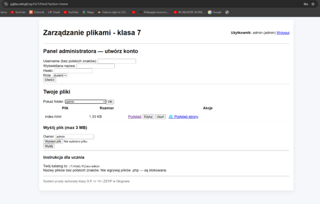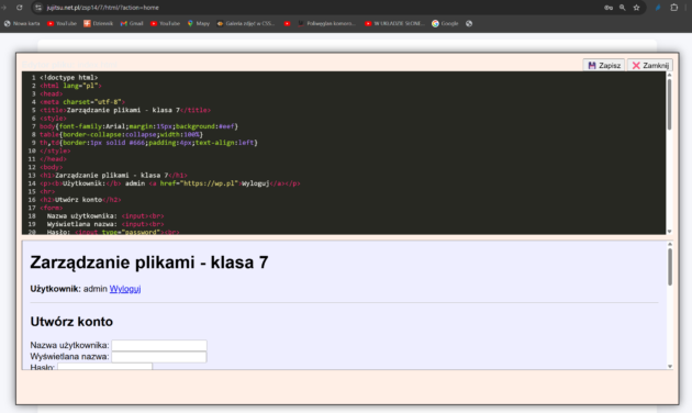 Kierownikiem zespołu uczniów klasy 3ta była Laura Kujawa, która koordynowała działania techniczne i czuwała nad spójnością kodu tworzonego przez grupę. Celem przedsięwzięcia było stworzenie funkcjonalnego systemu internetowego umożliwiającego uczniom logowanie się, przesyłanie plików oraz – co stanowiło kluczowy element projektu – edycję i podgląd przesyłanych plików z kolorowaniem składni kodu.