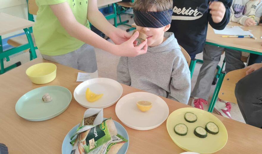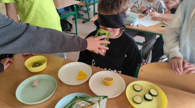W II grupie świetlicowej dzieci zrealizowały drugie zadanie w ramach projektu edukacyjnego „Gramy Zmysłami”. Tematem zajęć był zmysł węchu. Uczniowie mieli za zadanie rozpoznać różne zapachy, które zostały przygotowane w pojemniczkach. Wśród zapachów znalazły się m.in.: cynamon, oregano, kiwi, cebula, papryka chili, papryka słodka, czosnek, ogórek, cytryna. Podczas zajęć panowała radosna i pełna ciekawości atmosfera. Zajęcia dostarczyły dzieciom wielu pozytywnych wrażeń i stały się doskonałą okazją do rozwijania spostrzegawczości i umiejętności współpracy w grupie.